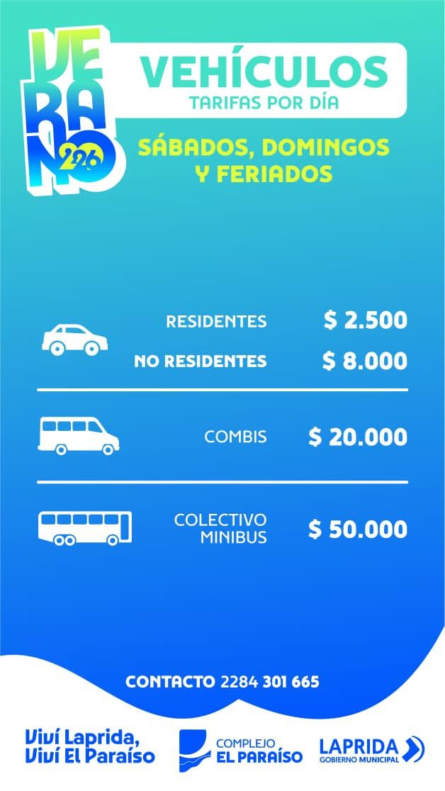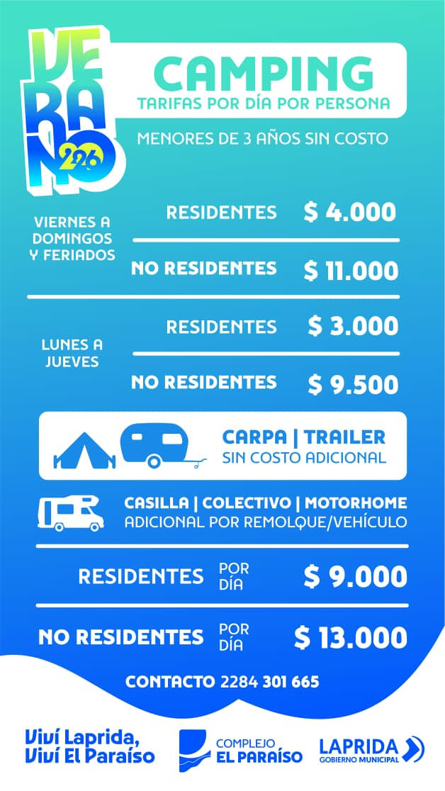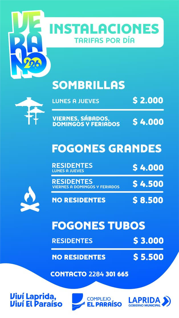 Durante la temporada de verano, el Balneario Municipal El Paraíso es uno de los principales atractivos de Laprida.Ofrece camping, actividades deportivas, eventos culturales y espectáculos para toda la familia.Información compartida con fines orientativos para quienes nos visitan.